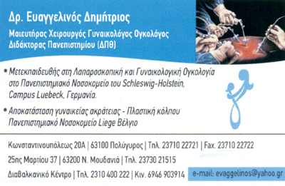 customer tabsΕπικοινωνίαΩράριο: Καθημερινά με ραντεβούΔρ. Παρασκευή Γ. ΣκαφιδάΜαιευτήρας - Χειρουργός ΓυναικολόγοςΔρ. Ευαγγελινός ΔημήτριοςΜαιευτήρας Χειρουργός Γυναικολόγος ΟγκολόγοςΔιδάκτορας Πανεπιστημίου (ΔΠΘ)2ο Ιατρείο: 25ης Μαρτίου 37, Νέα Μουδανιά, Χαλκιδική, τηλ.: 2373021515Διαβαλκανικό Κέντρο τηλ.: 2310400222Μαιευτήρες - ΓυναικολόγοιΥγείαΚωνσταντινουπόλεως 20Α, Πολύγυρος, ΧαλκιδικήΠΟΛΥΓΥΡΟΣ ΧΑΛΚΙΔΙΚΗΣΝΕΑ ΜΟΥΔΑΝΙΑ ΧΑΛΚΙΔΙΚΗΣΧΑΛΚΙΔΙΚΗΜΑΚΕΔΟΝΙΑ 2371022721 2373021515 6944901991 69469039142371022722pskafida@yahoo.grevaggelinos@yahoo.gr Το προτείνω (έχει προταθεί 0 φορές) ΦωτογραφίεςFacebook LikeShare on FacebookTweet Widget
